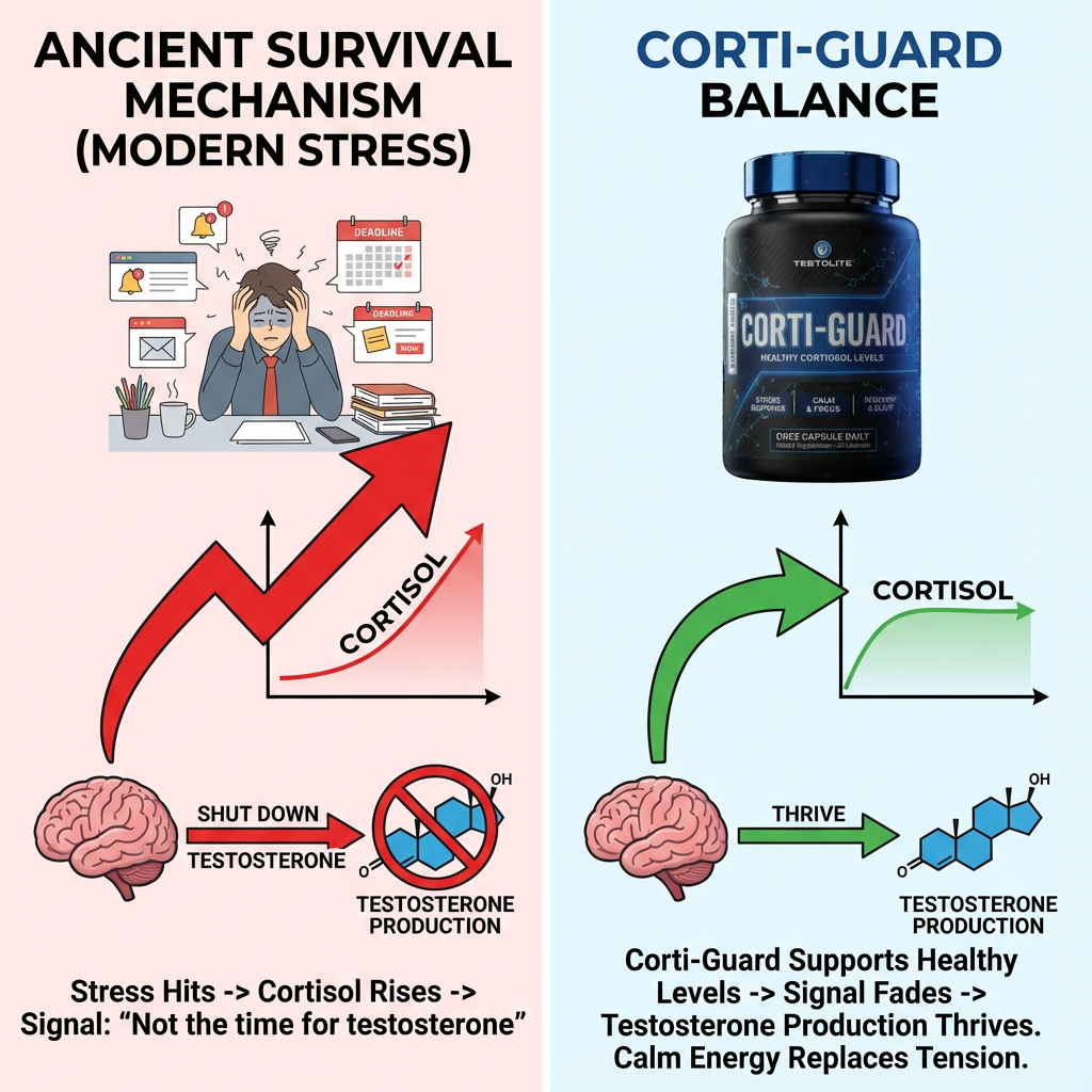When stress hits, cortisol rises. And when cortisol rises, your brain receives a clear signal: "We're under pressure—now is not the time for testosterone production."