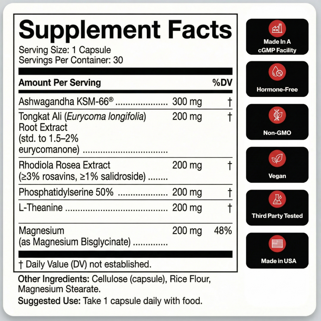 By supporting healthy cortisol levels, that "shut down" signal fades. Your body relaxes into a state where testosterone production thrives. Calm energy replaces anxious tension. And your results accelerate.